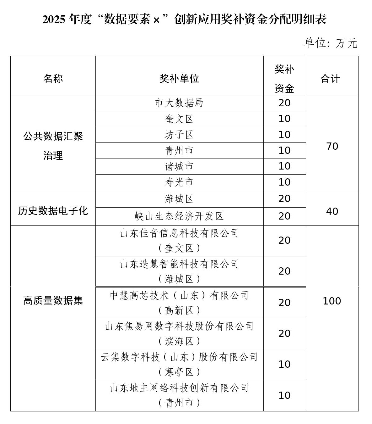 潍坊市关于2025年度“数据要素×”创新应用奖补资金分配结果的公告