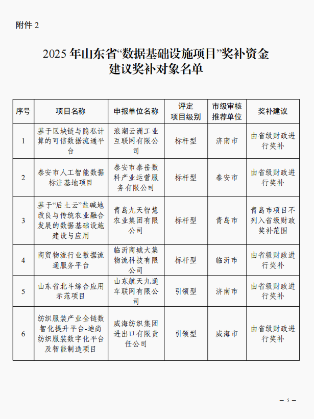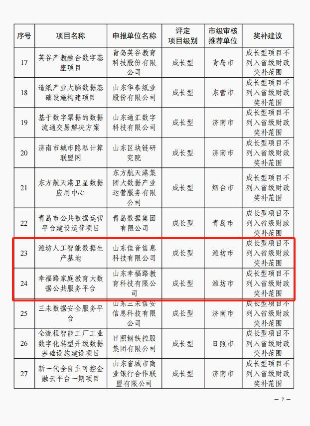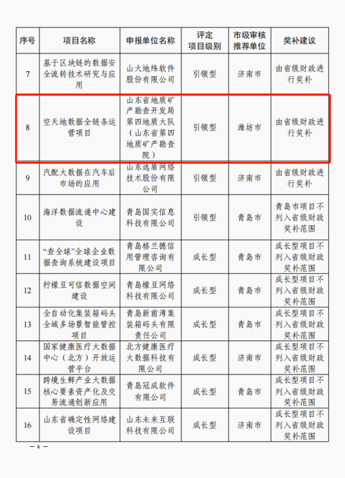 近日,山东省大数据局公示了2025年山东省数据基础设施建设奖补资金建议奖补对象名单。潍坊市山东省地质矿产勘查开发局第四地质大队(山东省第四地质矿产勘查院) 空天地数据全链条运营项目、山东佳音信息科技有限公司潍坊人工智能数据生产基地、山东幸福路教育科技有限公司幸福路家庭教育大数据公共服务平台共3个项目入选2025年山东省“数据基础设施项目”奖补资金建议奖补对象名单。