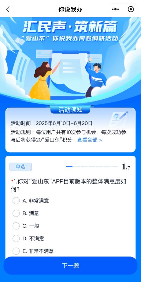 2025年6月10日,“爱山东”政务服务平台“你说我办”问卷调研活动正式启动。本次活动以“汇民声·筑新篇”为主题,旨在全面了解广大用户对“爱山东”新版本的需求和期待,全面提升平台服务质量和使用体验。
