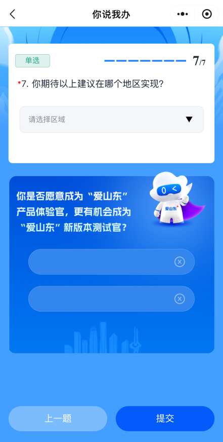 1. 打开“爱山东”APP、微信、支付宝小程序,首页搜索“你说我办”,或点击首页活动图片直接进入活动页面。