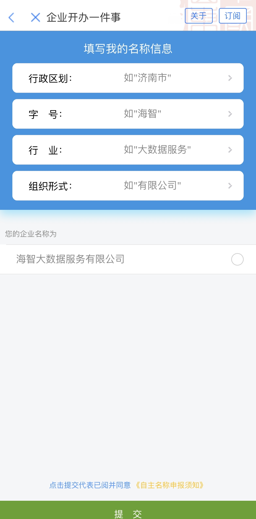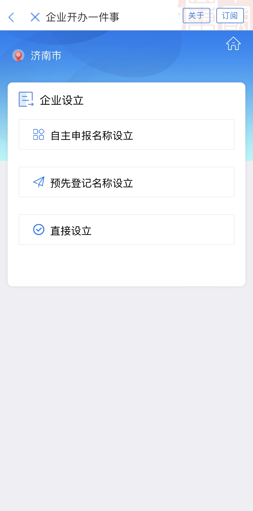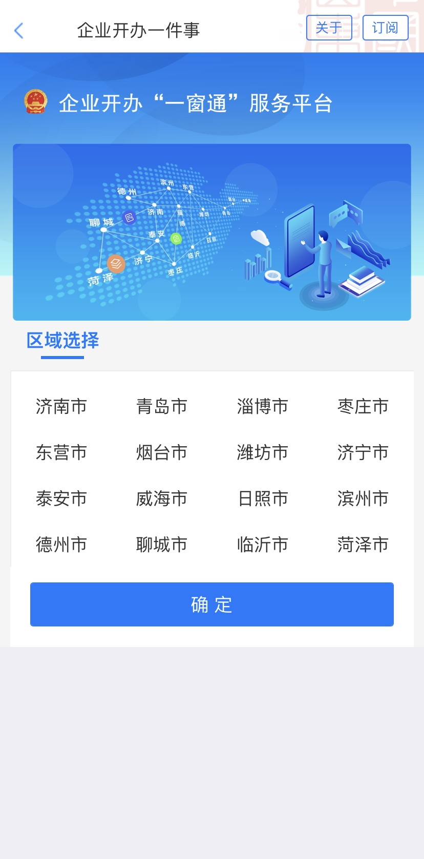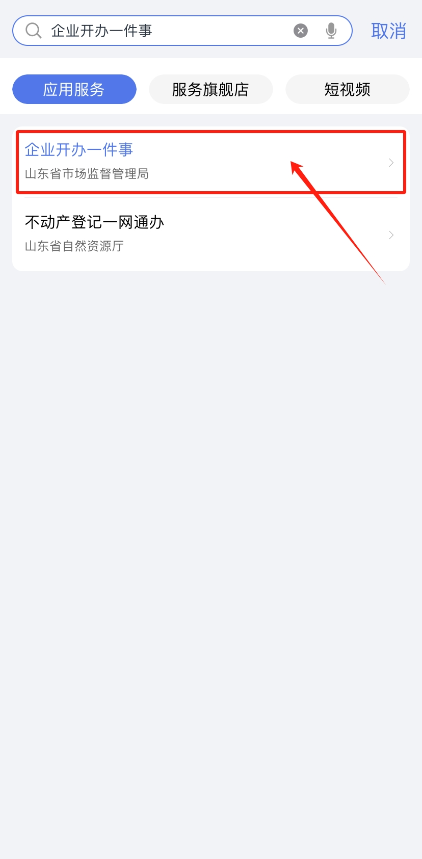 登录“爱山东”APP,首页搜索“企业开办一件事”进入服务;选择业务办理区域和需要开办的主体类型(以企业为例)。