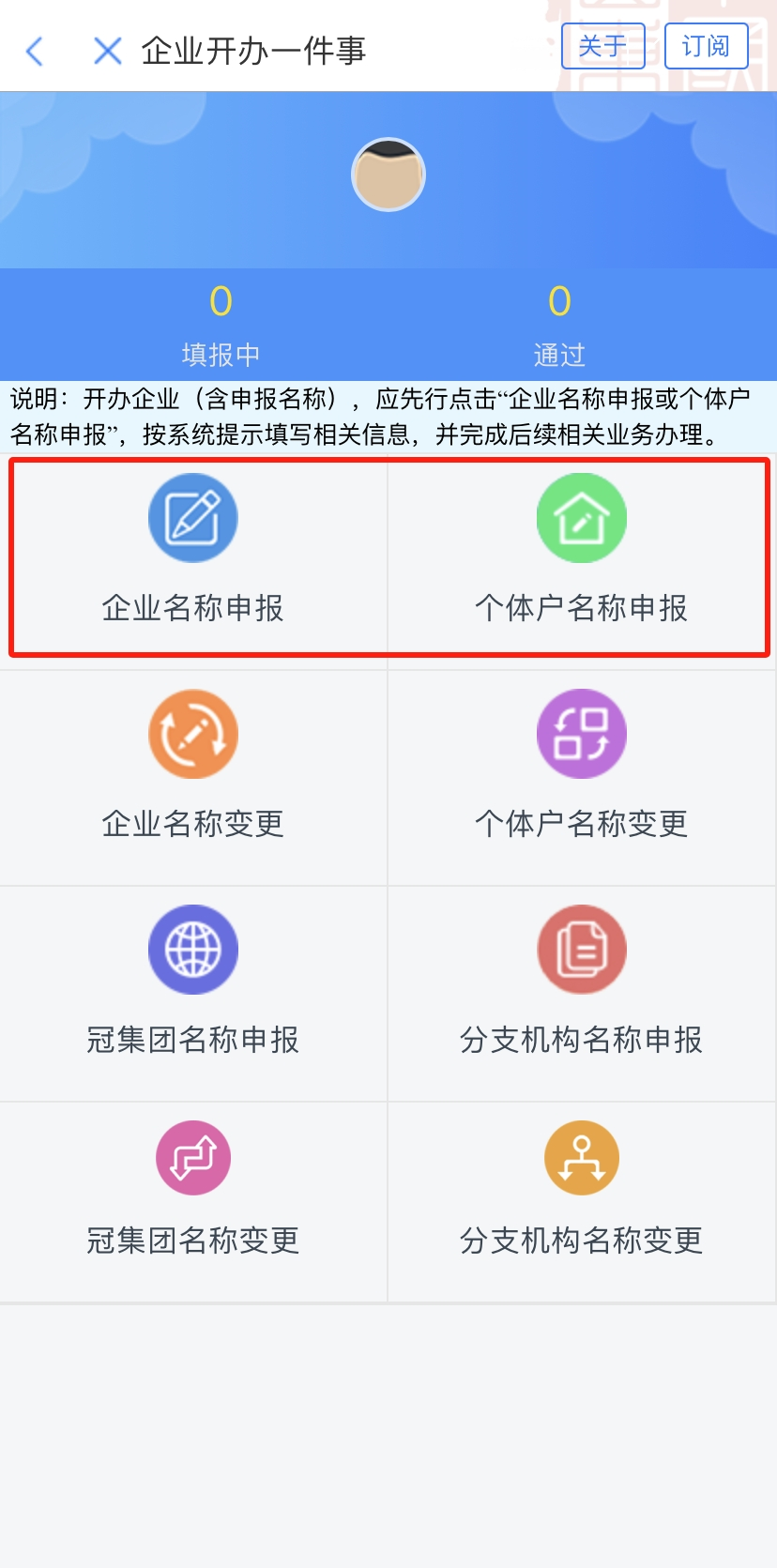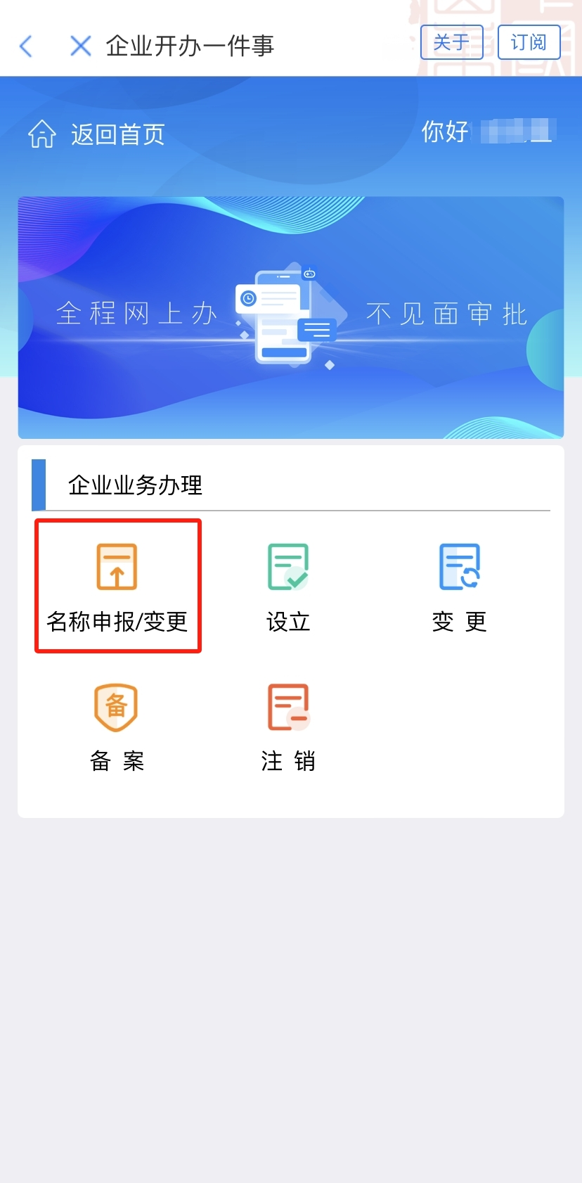 开办企业首先需进行企业名称申报,点击进入“名称申报/变更”,选择企业名称申报,根据系统提示输入企业名称,填写相关信息后提交名称信息。