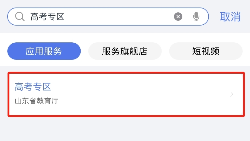 打开“爱山东”APP、支付宝、微信小程序,首页搜索“高考专区”点击进入。
