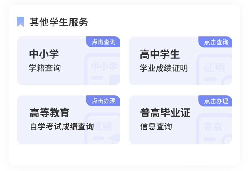 如学生及家长还有中小学学籍查询、高中学业成绩证明、自考成绩查询、普通高中毕业证信息查询等服务需求,还可以直接通过“其他学生服务”一栏选择进入相应服务查询办理。