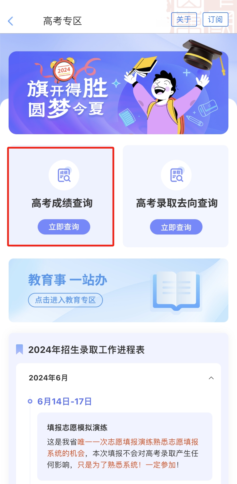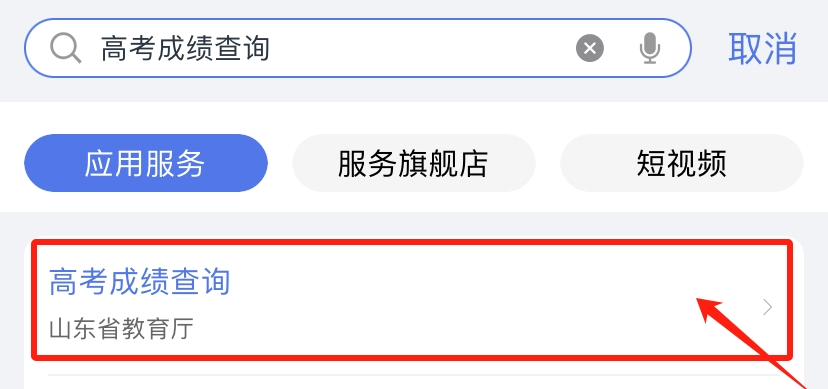 1.进入“爱山东”APP、支付宝、微信小程序,首页搜索“高考成绩查询”进入服务。