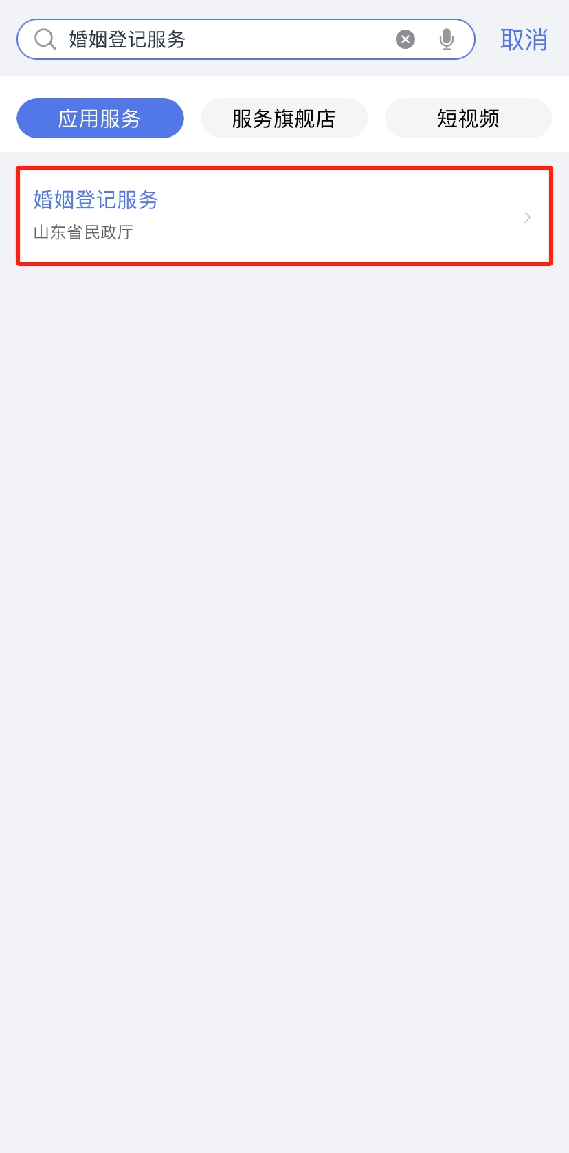 1.进入“爱山东”APP、支付宝、微信小程序,首页搜索并进入“婚姻登记服务”,选择“结婚登记预约”功能。