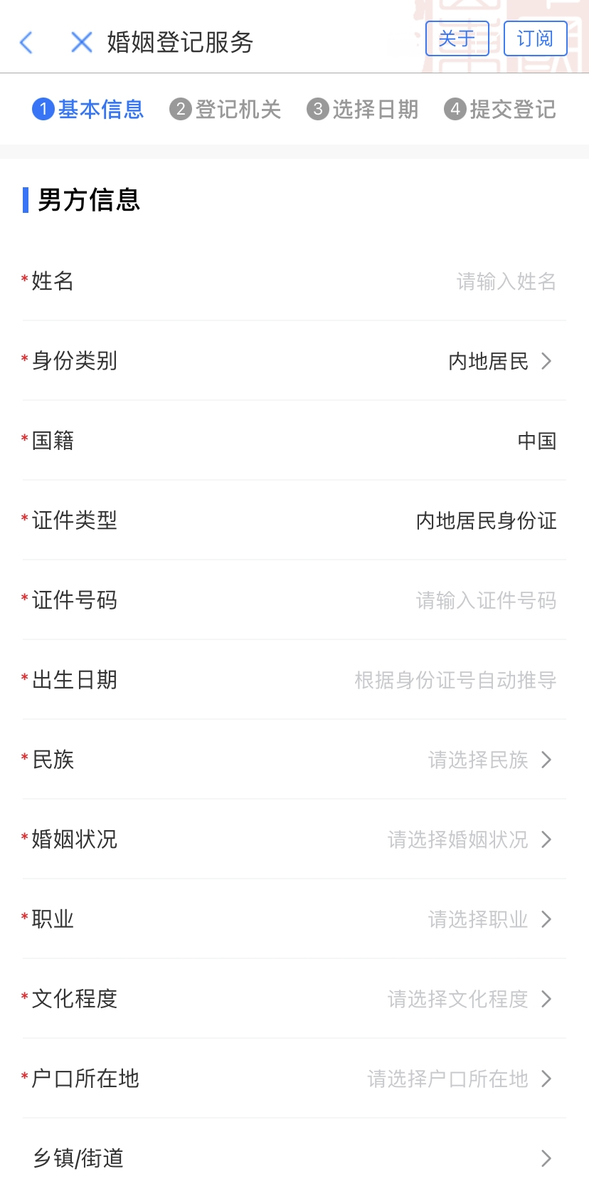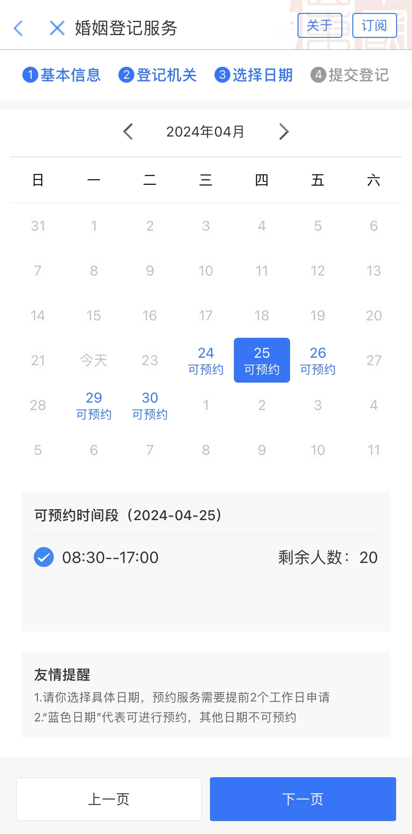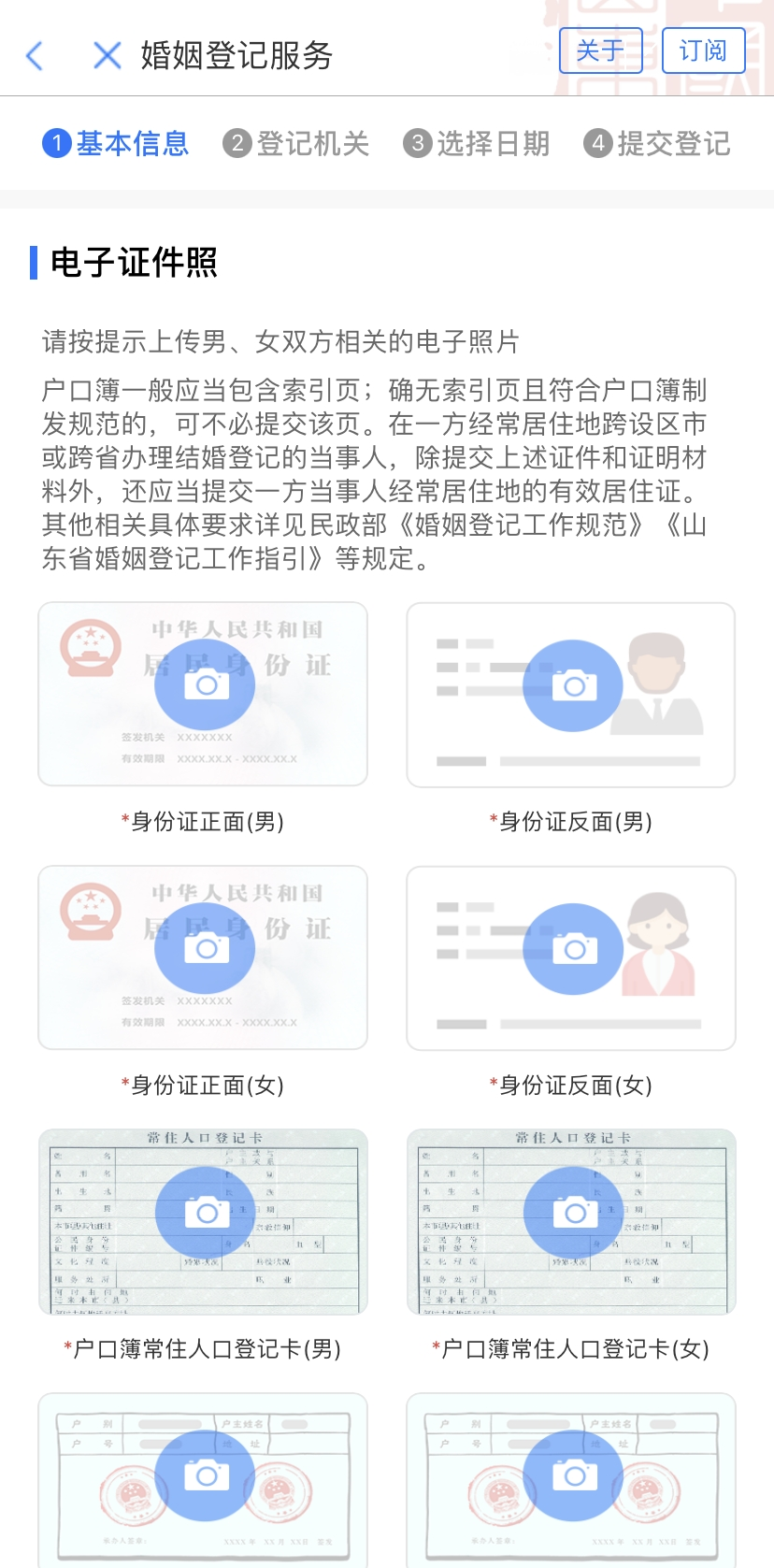 3.根据页面提示,填写男女双方信息,并上传身份证、户口簿、居住证等材料。随后,可就近选择登记机关、预约日期及时段(具体可预约的机关、日期与时段以页面显示为准)。