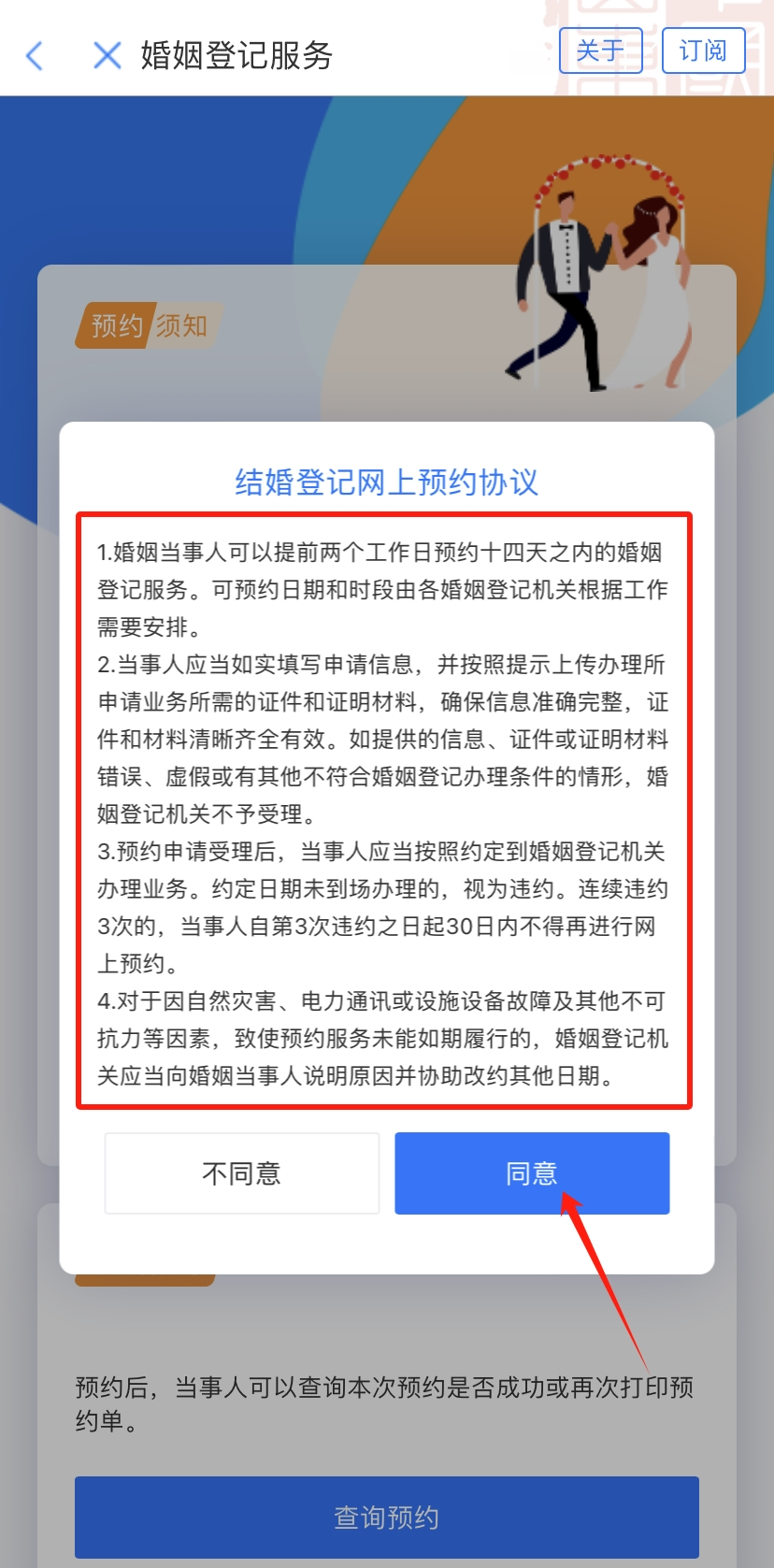 2.仔细阅读预约须知与结婚登记网上预约协议,确认符合相关条件后,即可按照页面提示进入预约流程。