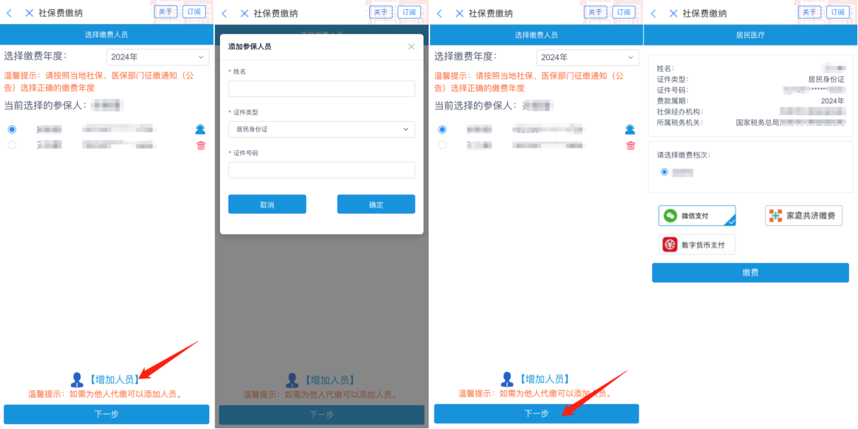 5、以缴纳居民基本医疗保险为例,先选择缴费年度及参保人。若需为他人代缴,可点击下方“添加人员”,并填写参保人员姓名及证件号码;