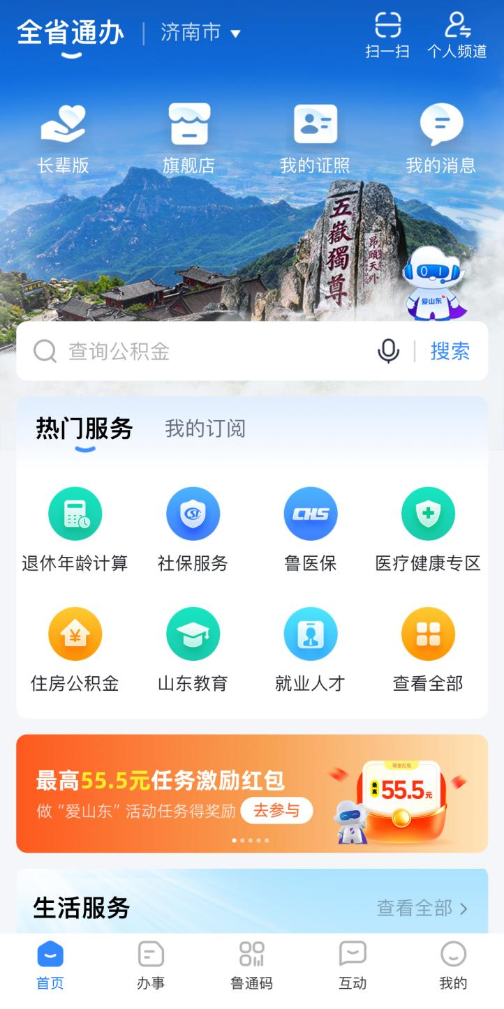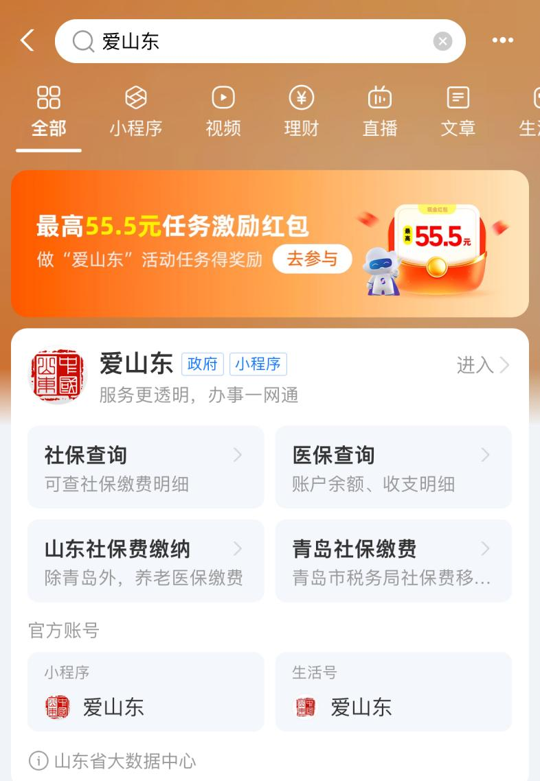 打开支付宝搜索“爱山东”,点击顶部【最高55.5元任务激励红包】“去参与”按钮,进入“爱山东”支付宝小程序,即可一键参与。
