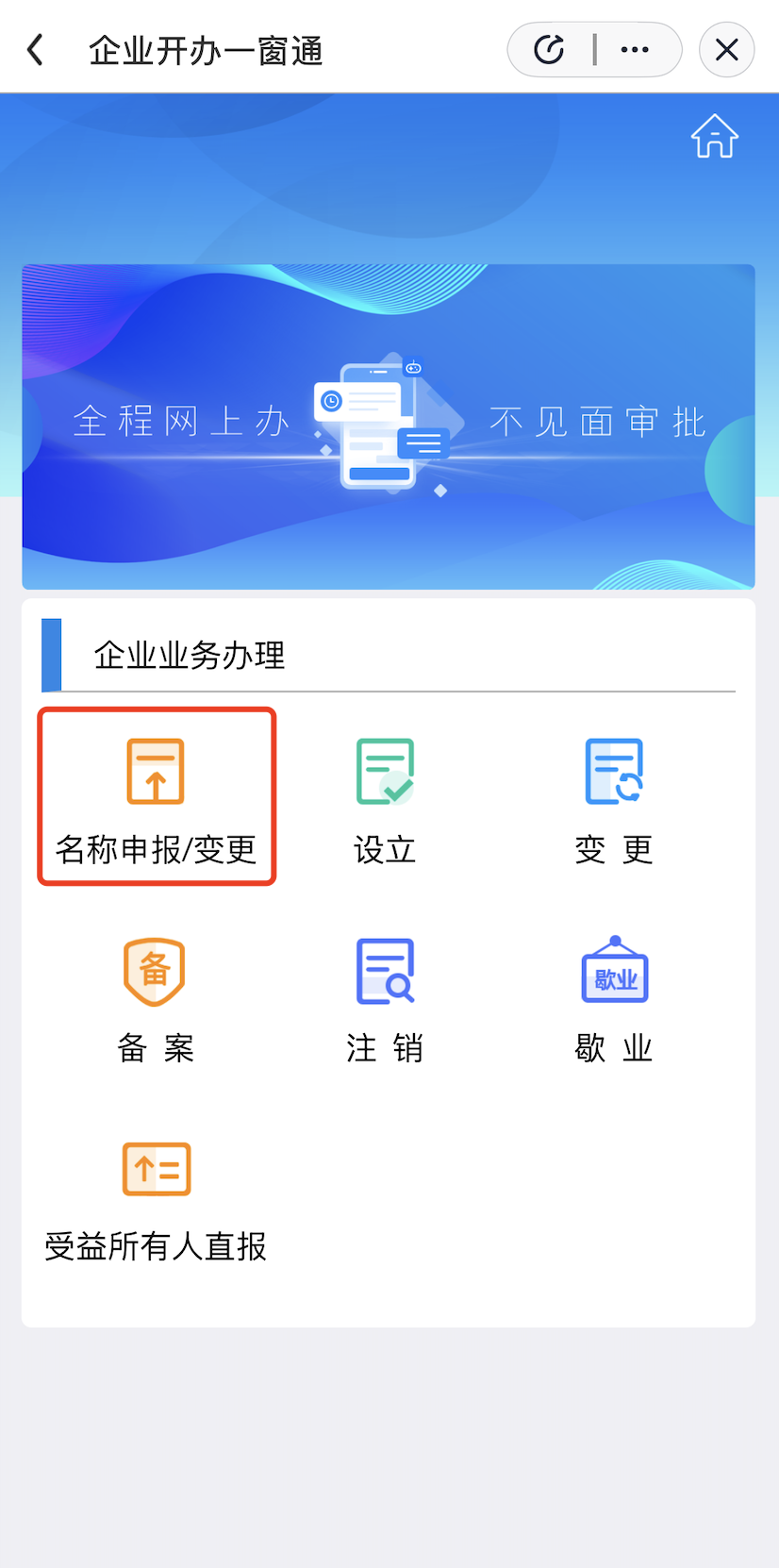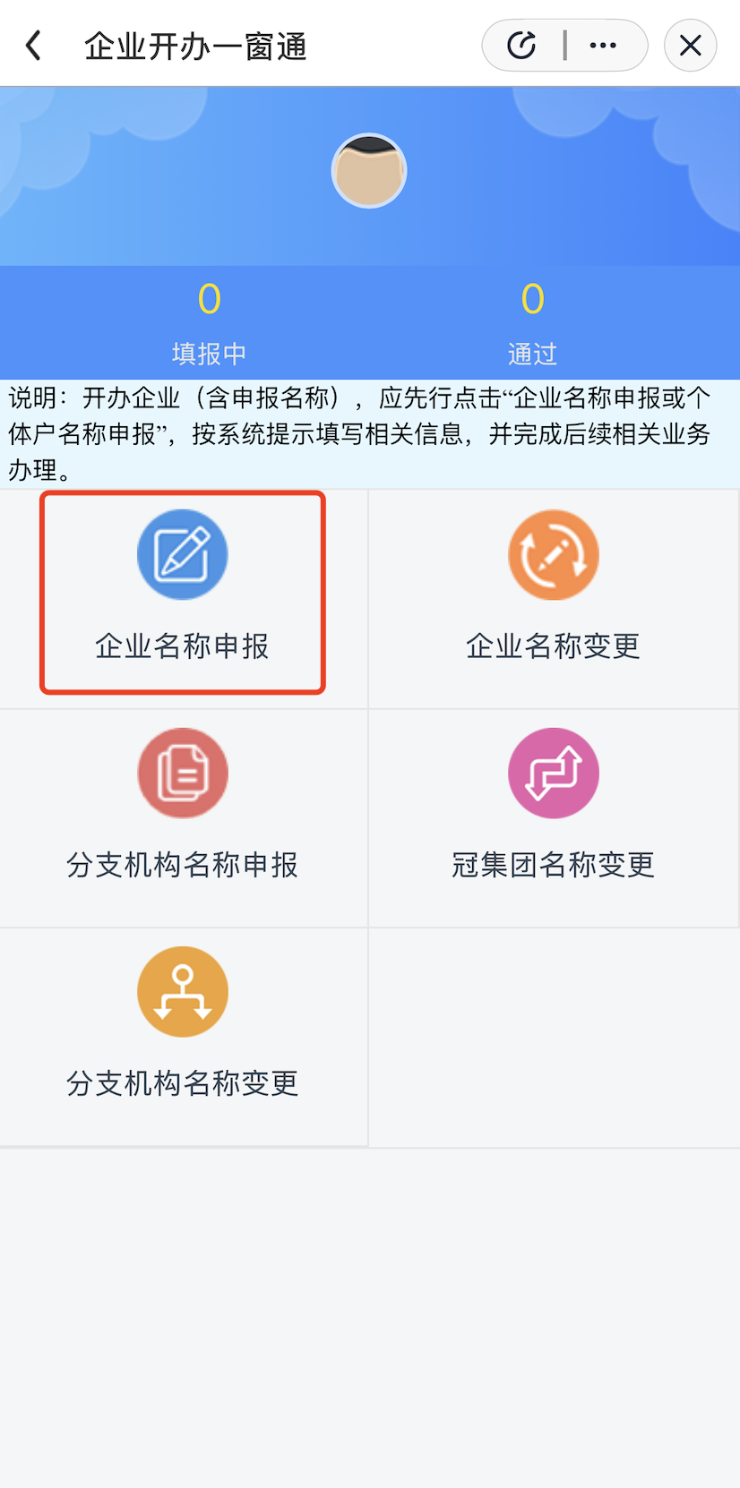 开办企业首先需进行企业名称申报。点击进入“名称申报/变更”,选择企业名称申报,根据系统提示输入企业名称,填写相关信息后提交名称信息。