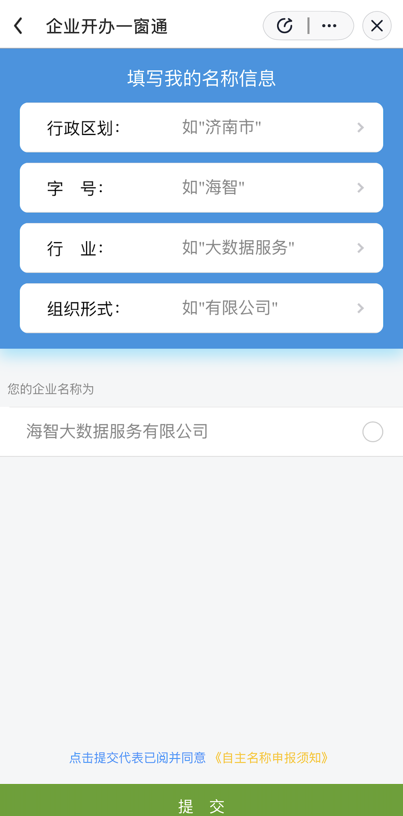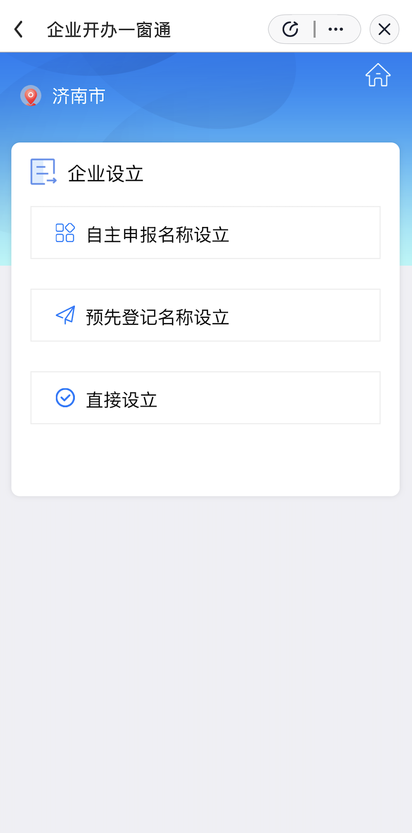 登录“爱山东”APP,首页搜索“企业开办一窗通”进入服务,选择业务办理区域和需要开办的主体类型(以企业为例)。