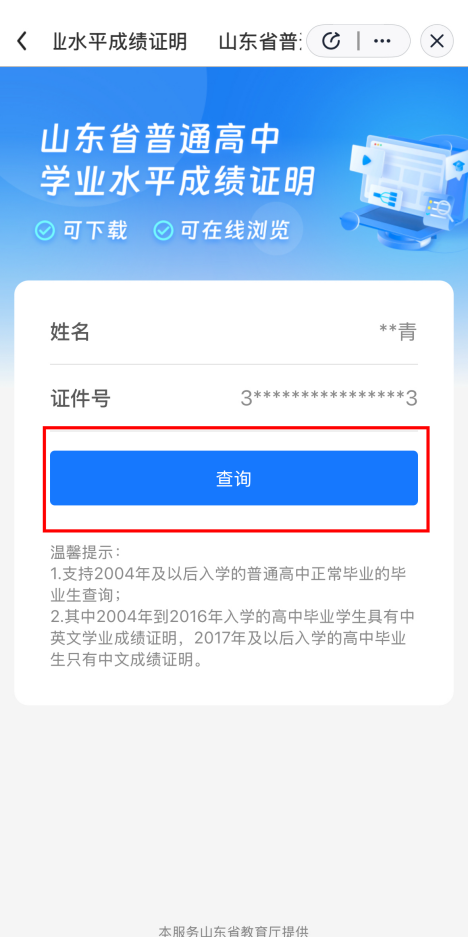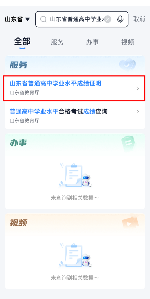打开“爱山东”APP、支付宝或微信小程序,首页搜索“山东省普通高中学业水平成绩证明”,点击进入服务;