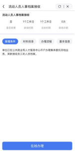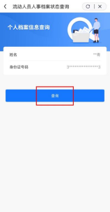 在“档案服务”版块中,点击进入“流动人员人事档案状态查询”服务,点击“查询”按钮,即可查看自己的档案号、档案状态、转入时间、存档机构名称等信息。