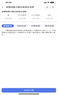 档案存放在档案管理服务机构后,如需开具存档证明等证明材料,可以在“档案服务”版块中,点击进入“依据档案记载出具相关证明”服务,办理相关业务。