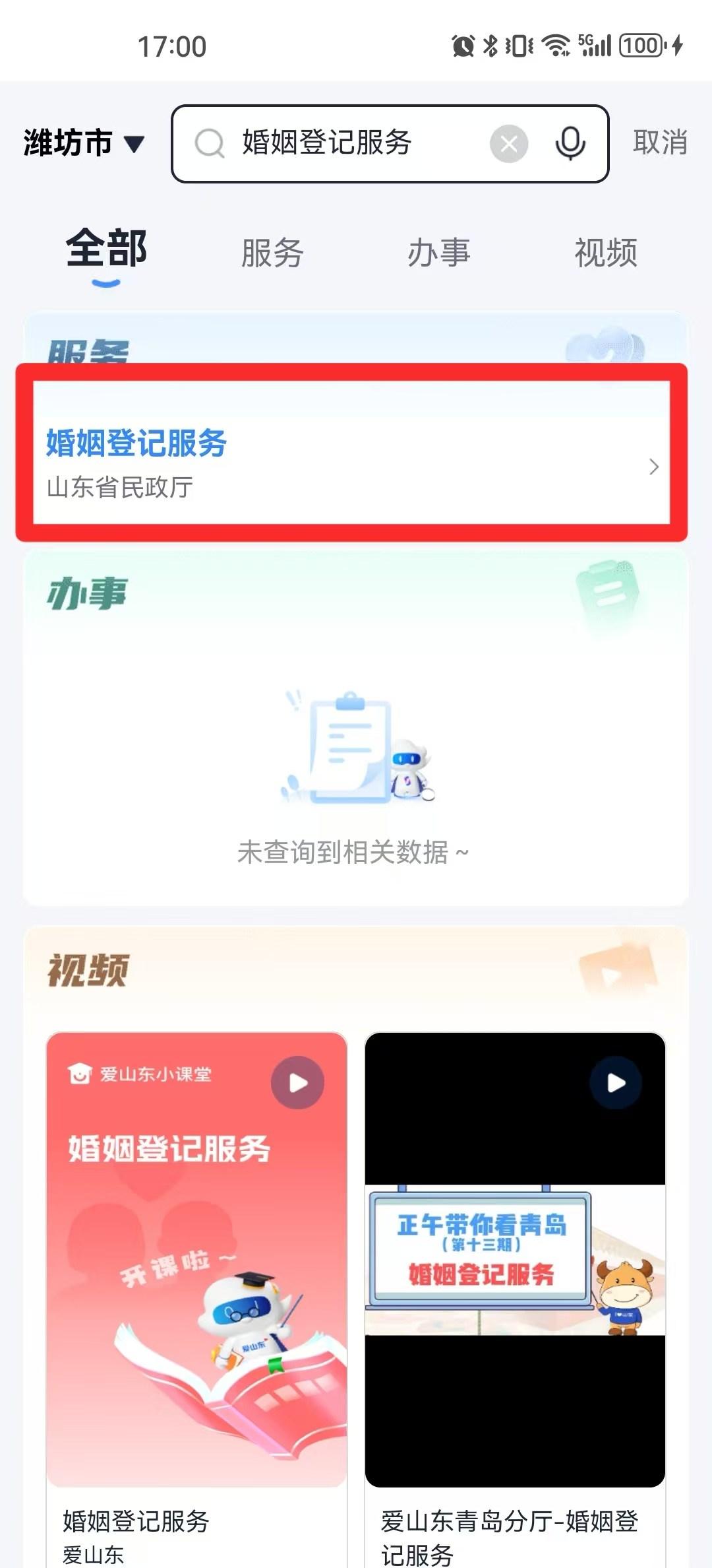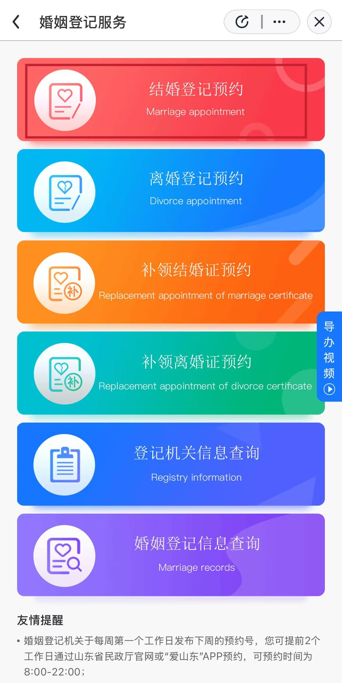 1.进入“爱山东”APP、支付宝、微信小程序,首页搜索进入“婚姻登记服务”,选择“结婚登记预约”。
