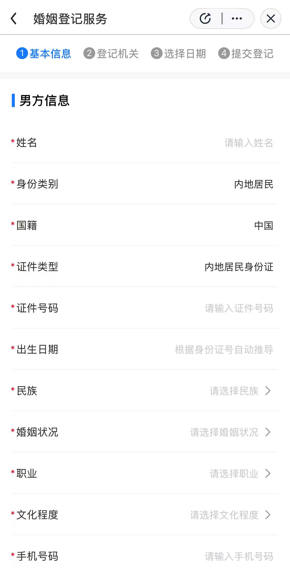 3.根据页面提示填写男女双方信息,就近选择登记机关、预约日期及时段。